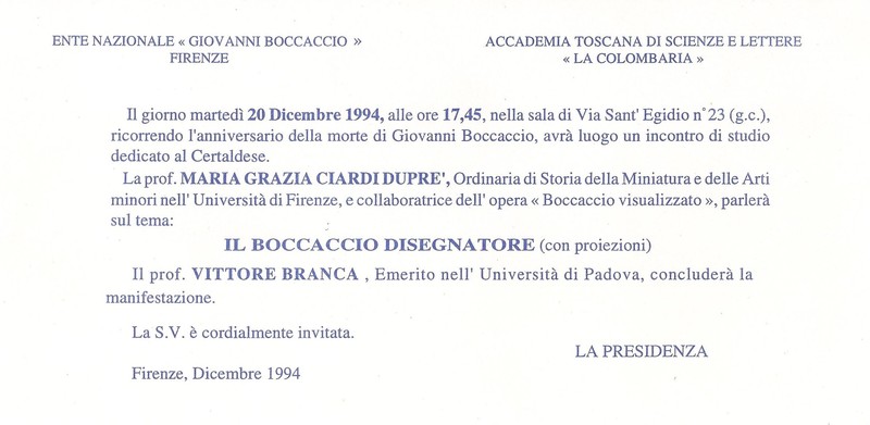 Nell'anniversario della morte di Giovanni Boccaccio la prof. Maria Grazia Ciardi Duprè (Università di Firenze) parlerà sul tema