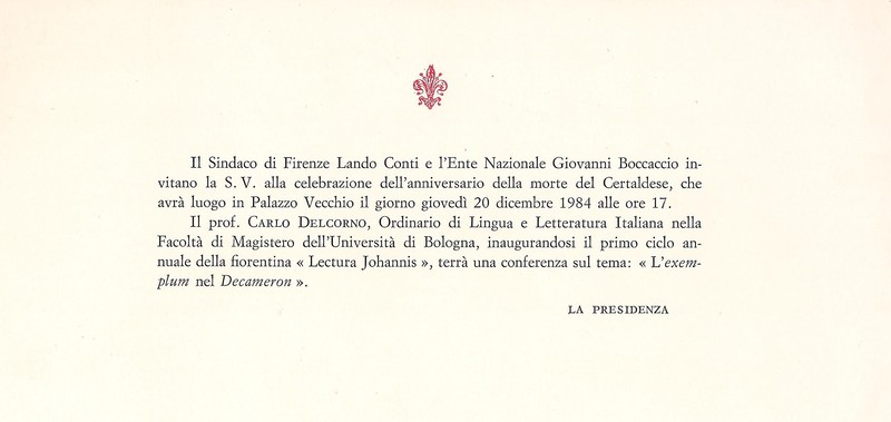 A ricordo dell'anniversario della morte di Giovanni Boccaccio, il prof. Carlo Delcorno (Università di Bologna), inaugurandosi il primo ciclo annuale della "Lectura Johannis", terrà una conferenza su