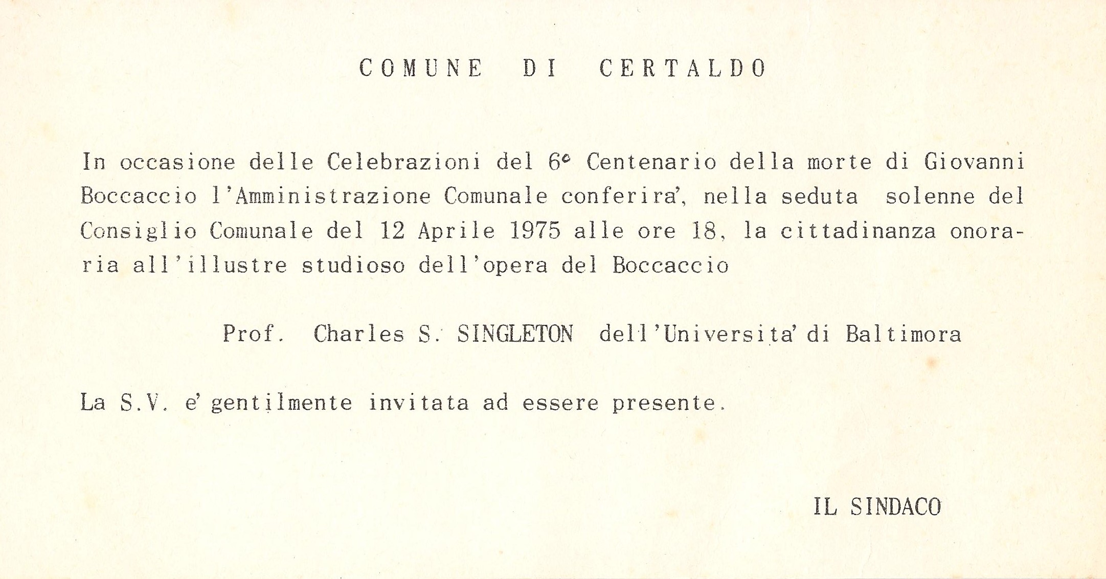 Cittadinanza onoraria al prof. Charles S. Singleton dell'Università di Baltimora