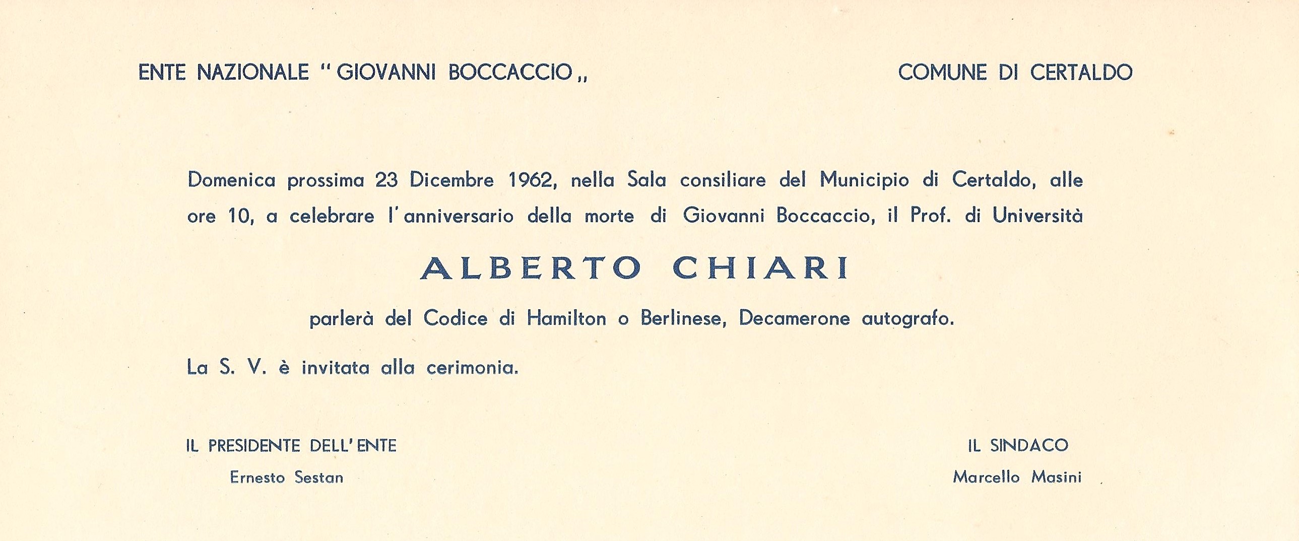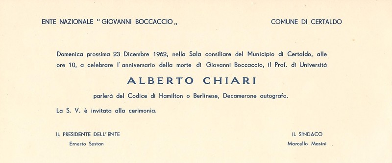 Nell'anniversario della morte di Giovanni Boccaccio, conferenza del prof. Alberto Chiari (Università Cattolica del Sacro Cuore di Milano)
