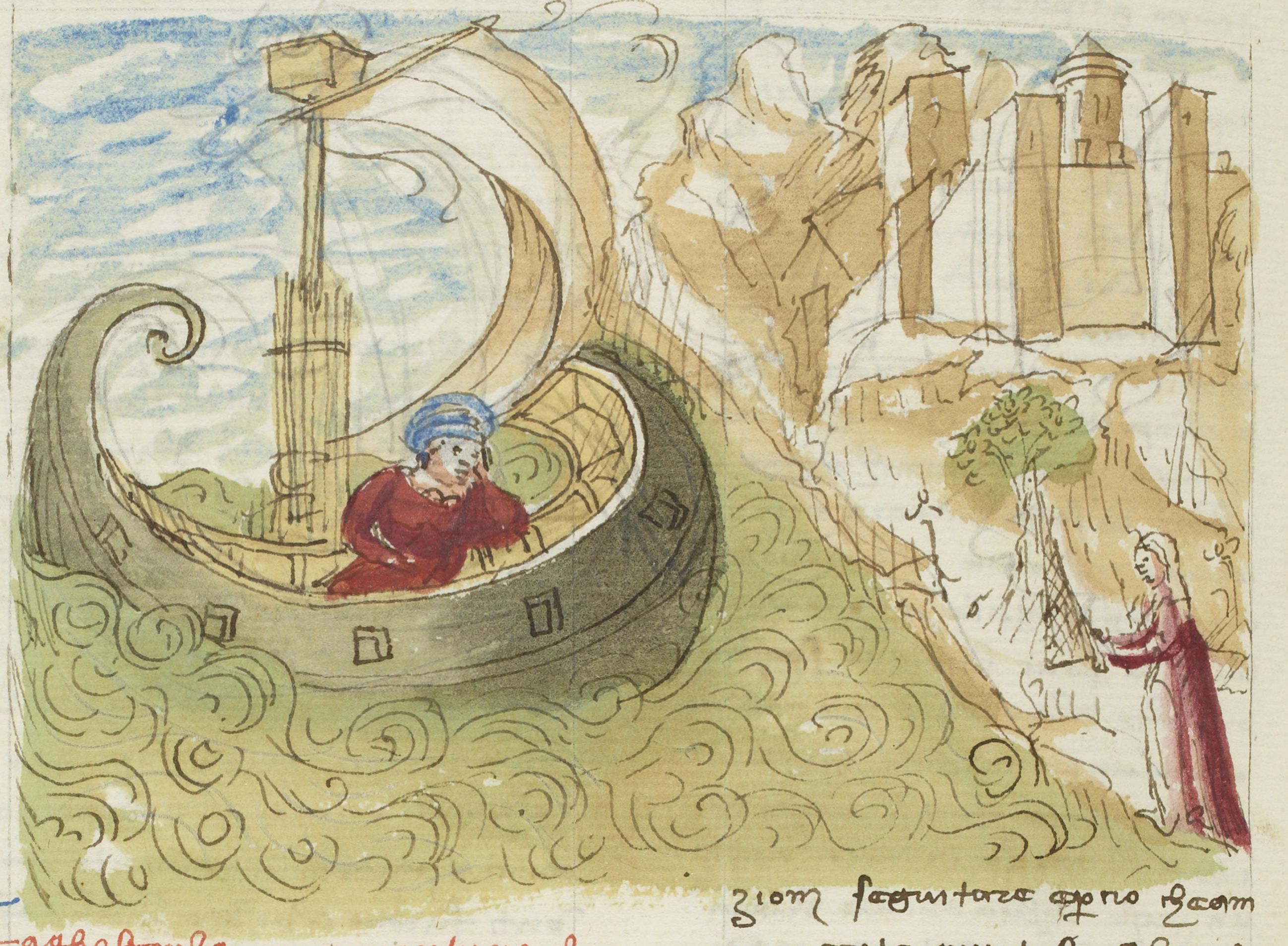 Parigi, Bibliothèque Nationale de France, It. 63, f. 169v. Il copista del manoscritto, datato 10 ottobre 1427, è Ludovico di Salvestro Ceffini. Gostanza, alla deriva su una barca, viene avvistata da Carapresa, la quale si trova a riva intenta a raccogliere le reti da pesca.